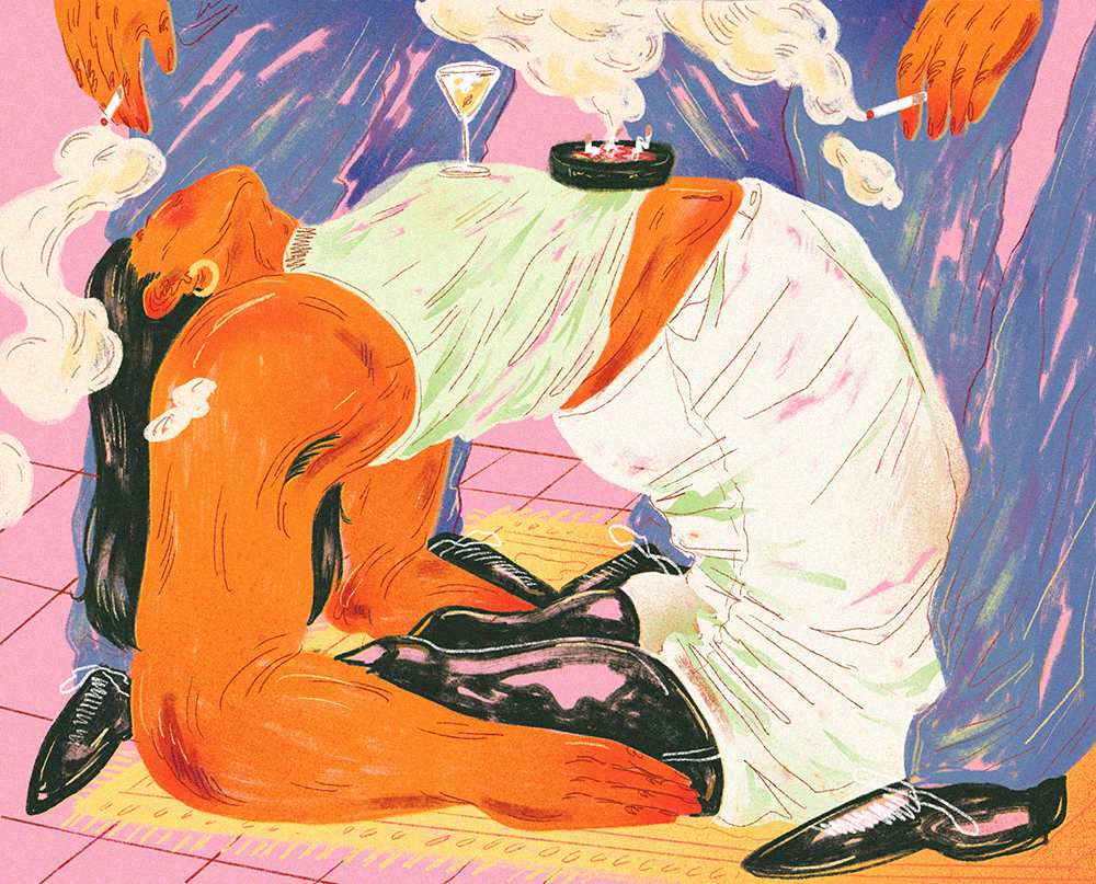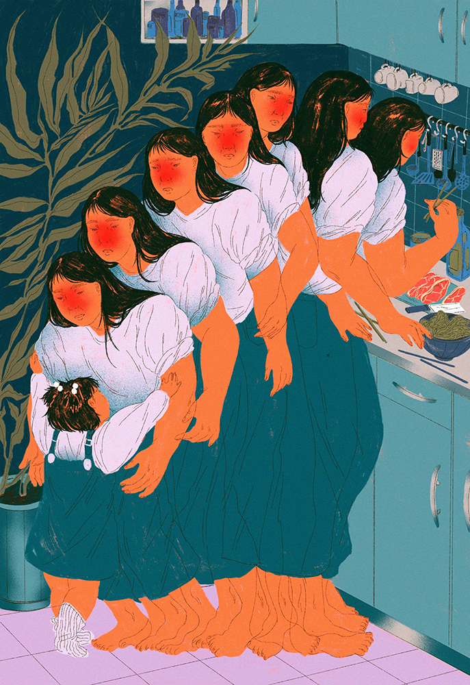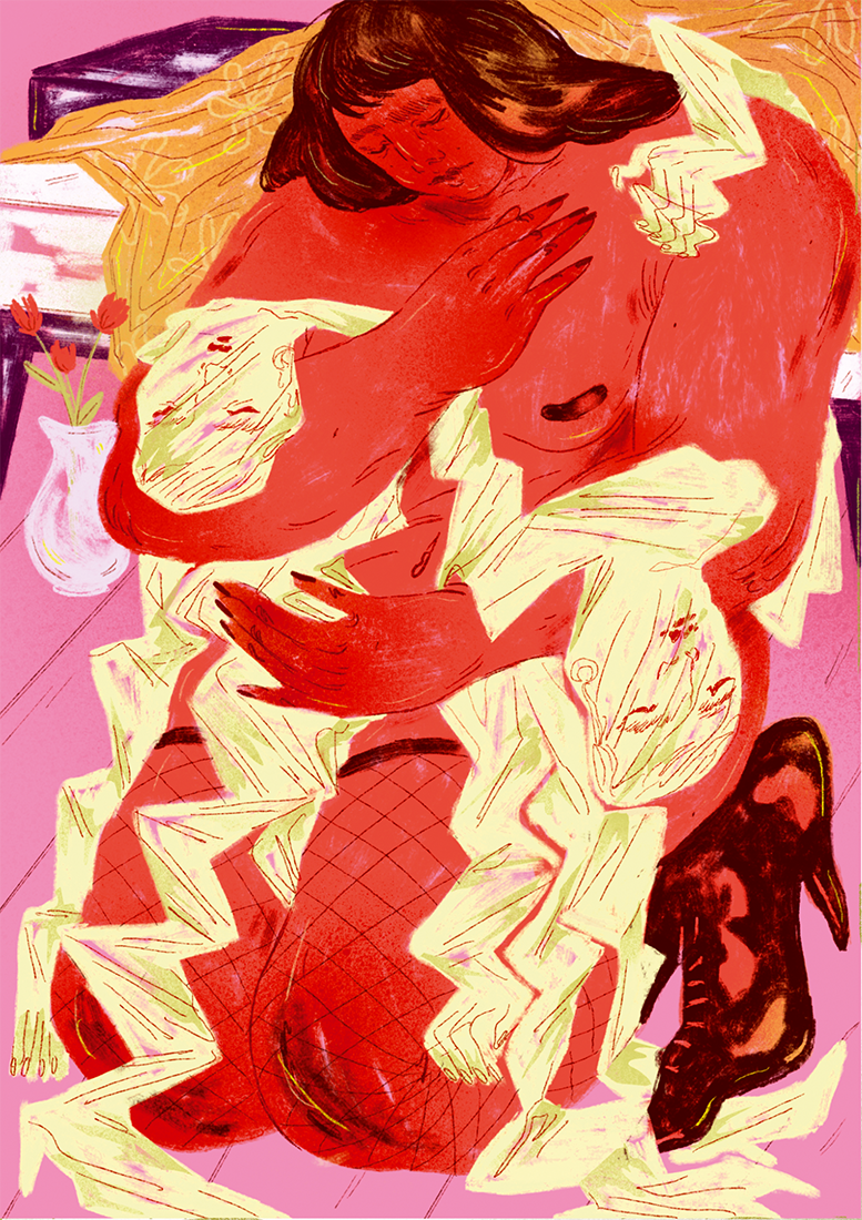 Le premier serait mon projet de diplôme. C’était il y a trois ans presque jour pour jour et j’ai beaucoup grandi depuis. Ces illustrations sont un peu dépassées par rapport à ce que je fais aujourd’hui. Mais ce projet m’a aidé à mûrir et m’a forcé à travailler des techniques que j’utilise toujours aujourd’hui. Ce projet touchait à des histoires intimes et personnelles, c’était donc aussi un projet très fort émotionnellement. J’ai fait des interviews avec des membres de ma famille, mes ami·es et aussi des étranger·es et leurs histoires m’inspirent encore aujourd’hui.