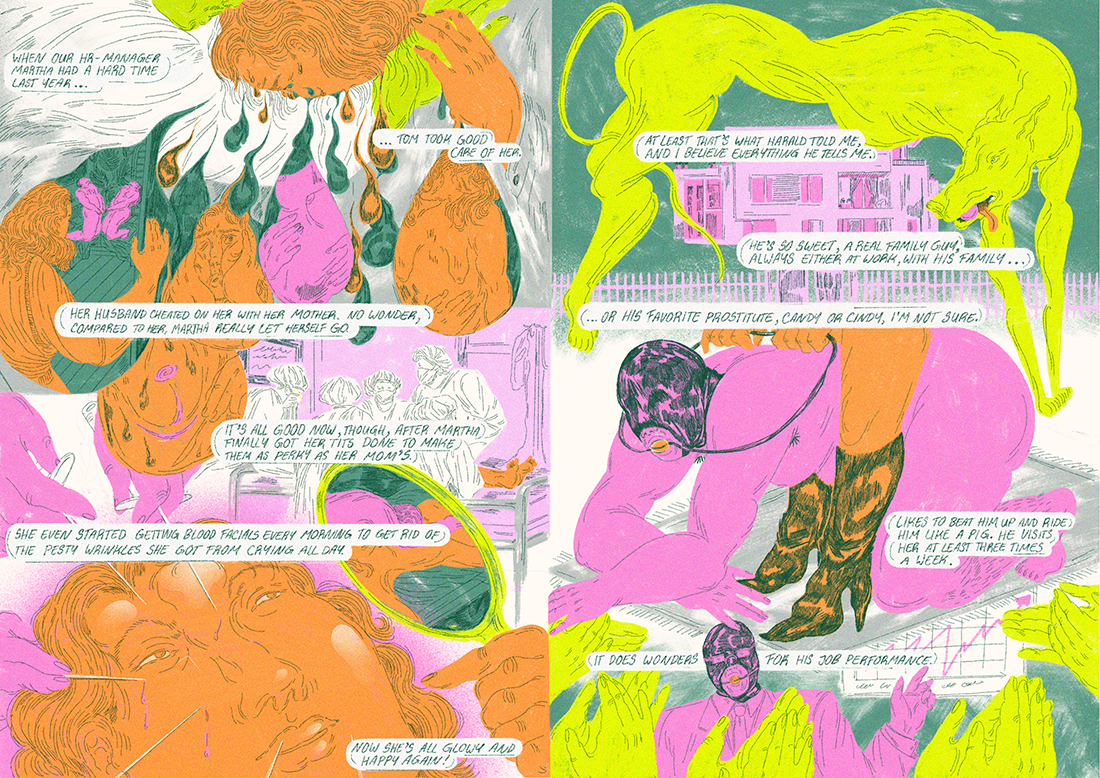 À coups de petits traits qui viennent capter chaque virgule de l’anatomie, en grossir les volumes ou en souligner la subtilité, l’Allemande donne à ses personnages la possibilité de se confesser sans l’usage de la parole. Les voici entonnant des chants d’amour ou des cris d’angoisse sans vacarme inutile, simplement par la position qu’ils prennent et le dialogue charnel qu’ils entament les uns avec les autres. La couleur, alors, vient prendre le relais de ces formes pour en accentuer les vibrations, donner une puissance à l’intime, rendre public ce qui n’appartient habituellement qu’au privé. Voici leur âmes, livrées pour vous.