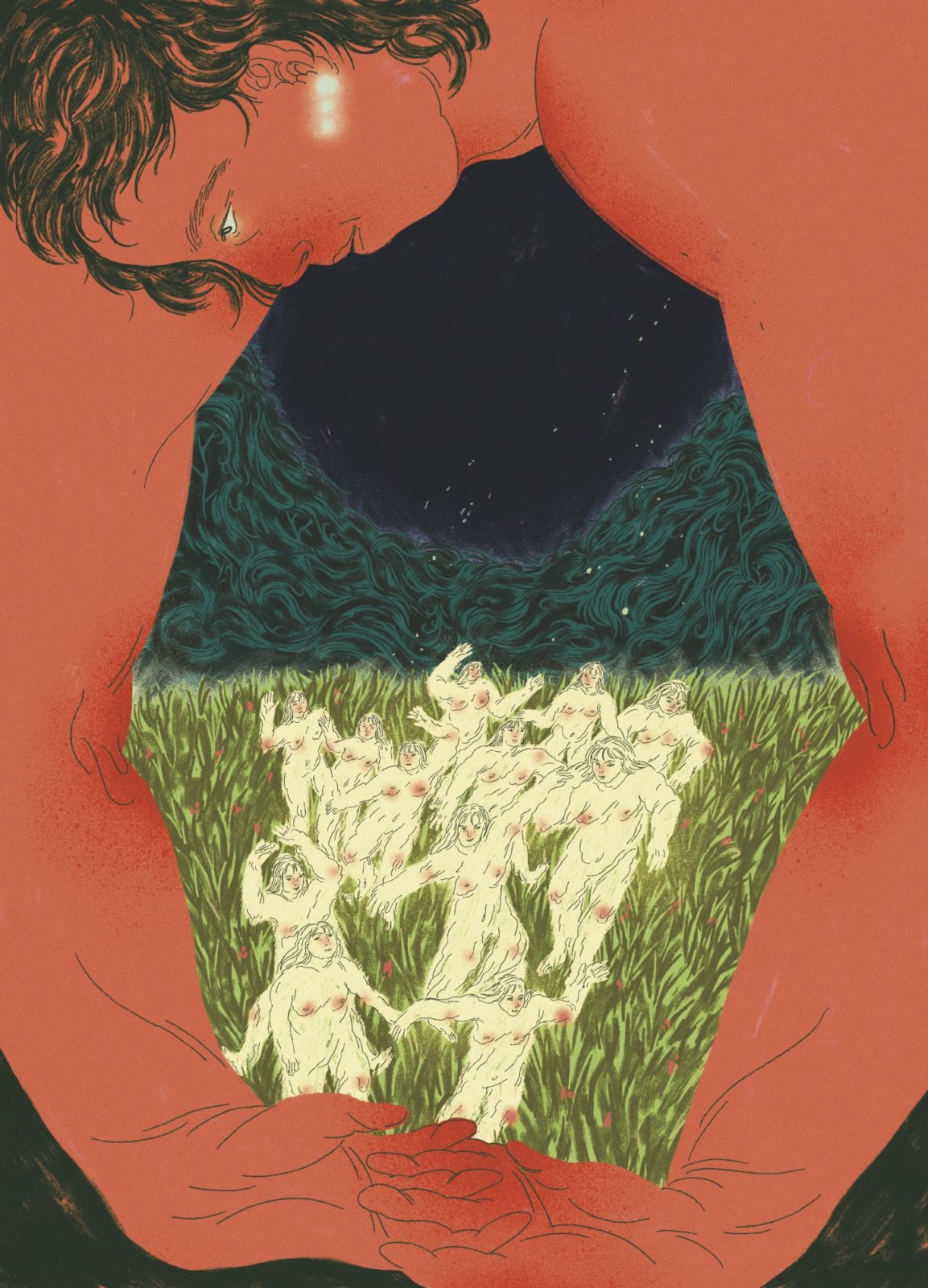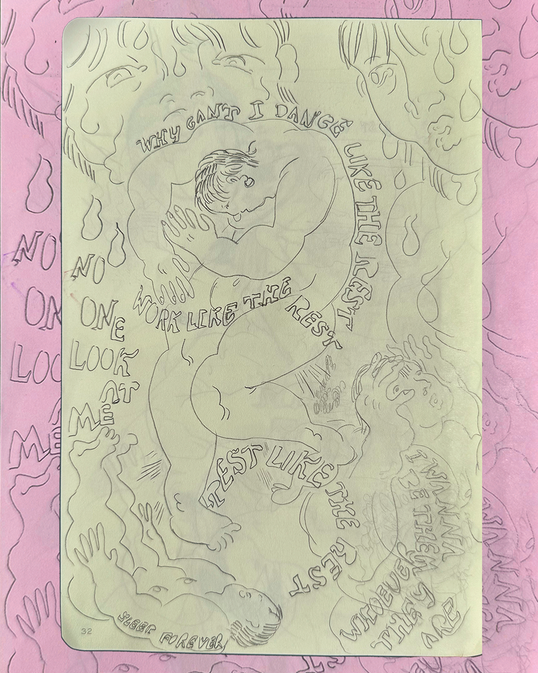 J’adore, j’adore, j’adore le corps, les plis, les cheveux et les rides. Sa douceur et les façons étranges qu’il a de bouger. Surtout les corps soumis à des remous profonds, qui se contorsionnent quand ils souffrent, quand ils sont heureux ou tristes – je trouve ça fascinant. En exagérer certaines parties, c’est pour moi une façon d’accentuer les sentiments que je veux représenter : un visage qui pleure si fort qu’il se met à fondre ; des bras immenses, prêts à enlacer ; des yeux grands ouverts, alertes et inquiets. Quand je suis anxieuse – ce que je suis souvent – les personnages dans mes dessins deviennent eux aussi très tendus et prennent des positions absolument pas naturelles.