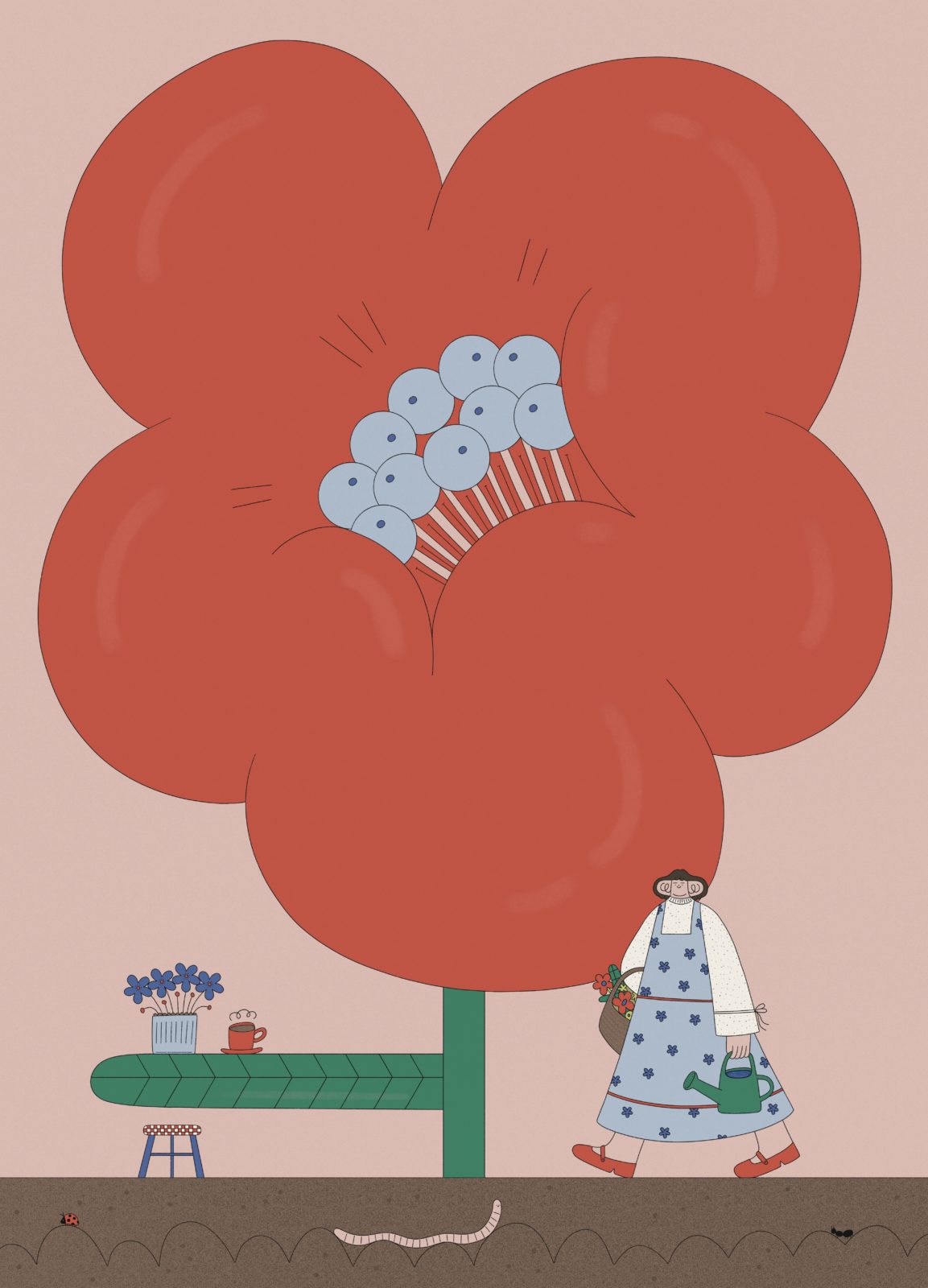 Bonjour Hollie ! Pour notre numéro « Là-Bas », tu as dessiné une sorte d’endroit rêvé avec une (très) grosse fleur, tout simplement parce que tu adores les fleurs. Qu’est-ce que tu adores dans ton métier d’illustratrice ?