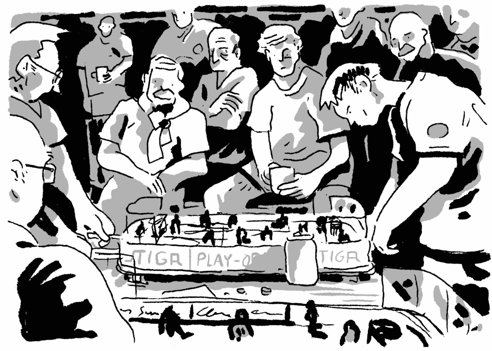 Le deuxième serait les dessins en noir et blanc que j’ai fait pendant un tournoi de hockey sur table près de chez moi. Les teintes grises ont été ajoutées ensuite numériquement. C’est aussi un mélange de dessins que j’ai fait directement sur place et d’autres que j’ai fini plus tard en me basant sur mes sketchs au crayon.