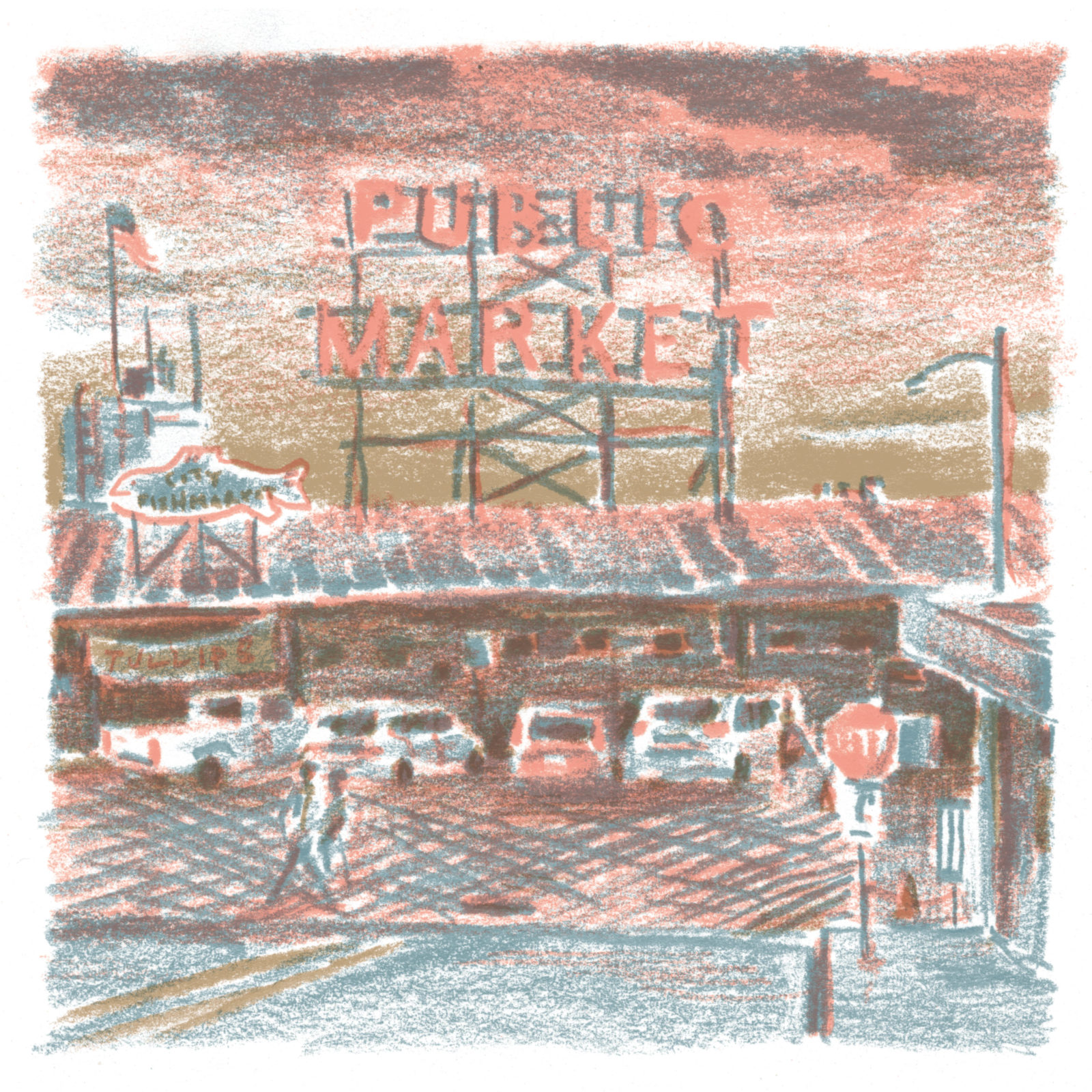 Mon image est une version très idéalisée de Seattle. Il n’y a pas d’endroit exactement comme ça là-bas. Je ne sais pas très bien pourquoi j’aime autant cette ville. J’y ai été une fois et pas très longtemps. Peut-être parce que c’était le premier voyage que je me payais moi-même. Peut-être parce que c’est le premier endroit où j’allais aux États-Unis dans lequel ni ma famille, ni mes ami·es n’étaient jamais allés. Peut-être parce que nous y étions avec ma compagne quelques semaines avant que nous nous mariions. C’est sans doute le mélange de tout ça. La réponse la plus simple est sans doute que c’est une grande ville avec d’incroyables paysages juste à côté. Et puis l’océan, les volcans, les montagnes : tout est plus grand que là où j’habite. Et le désert juste derrière ces montagnes, des cascades et toutes ces îles, à côté des gigantesques usines aéronautiques, un port énorme et des gares de triages géantes. Tout ça en un seul endroit. J’ai très envie d’y retourner. J’aimerais montrer Seattle à mon fils. Je pense qu’il aimerait…